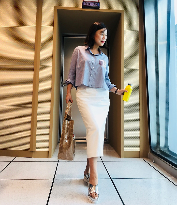 겨자색 옐로우 h라인 롱스커트를 같이 입으니 문안하지 않으면서 과하지도 않는 여성스러운 스타일이네요!